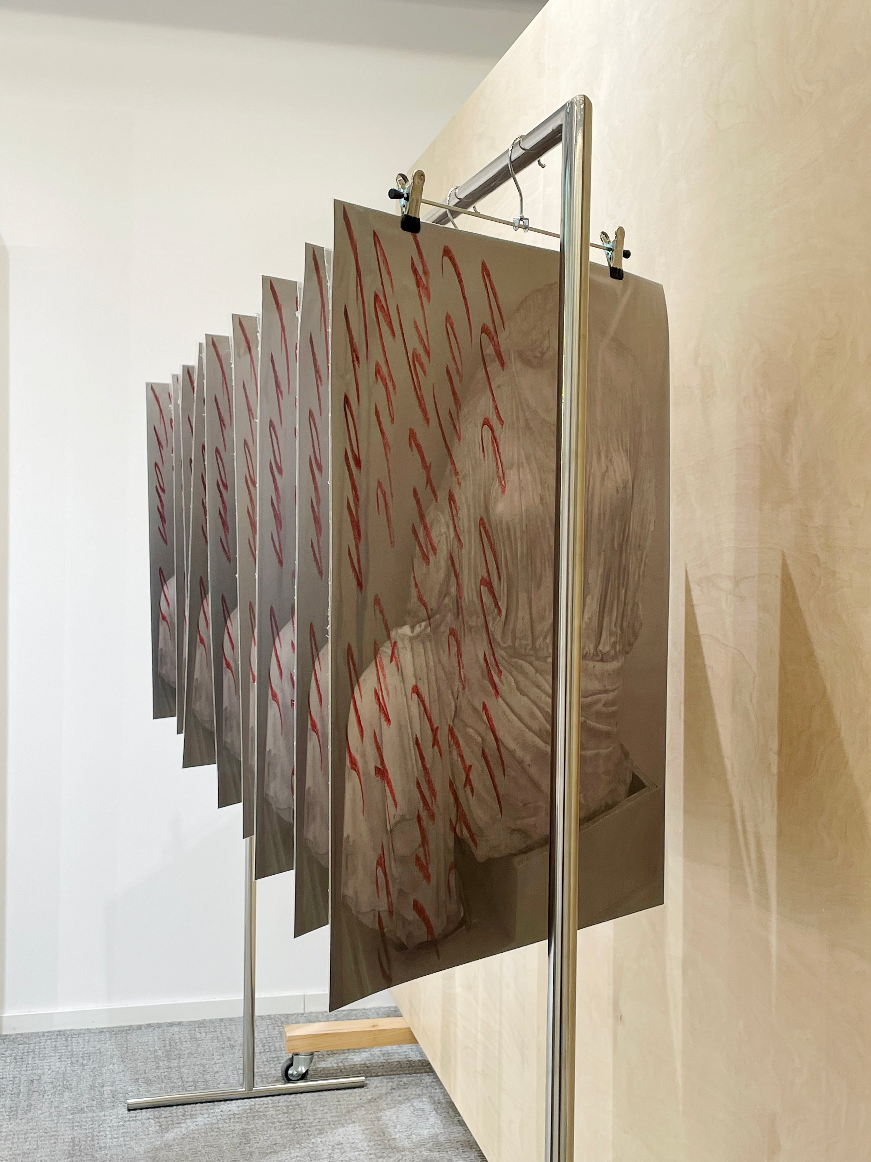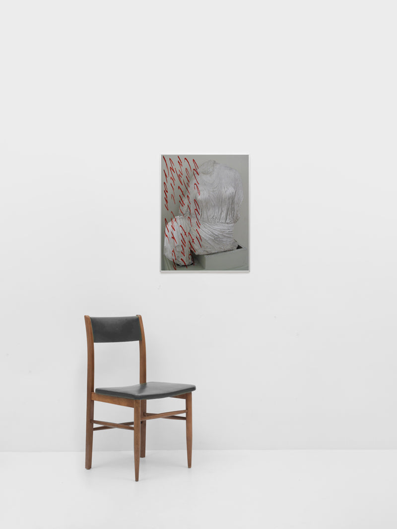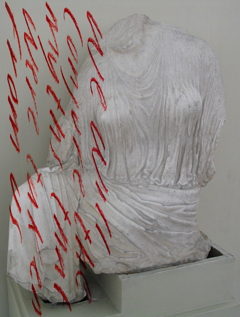 "We will conjure the myths that were taken from us” showcases an intervened archive image of The Statue of Penelope, a marble statue dating from approximately 500 BCE to around 480 BCE, which was discovered in the ruins of the Persepolis Treasury.